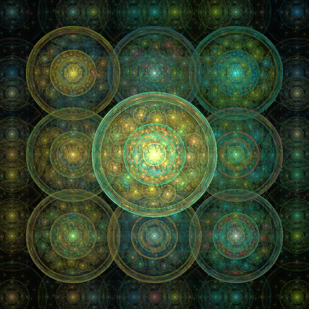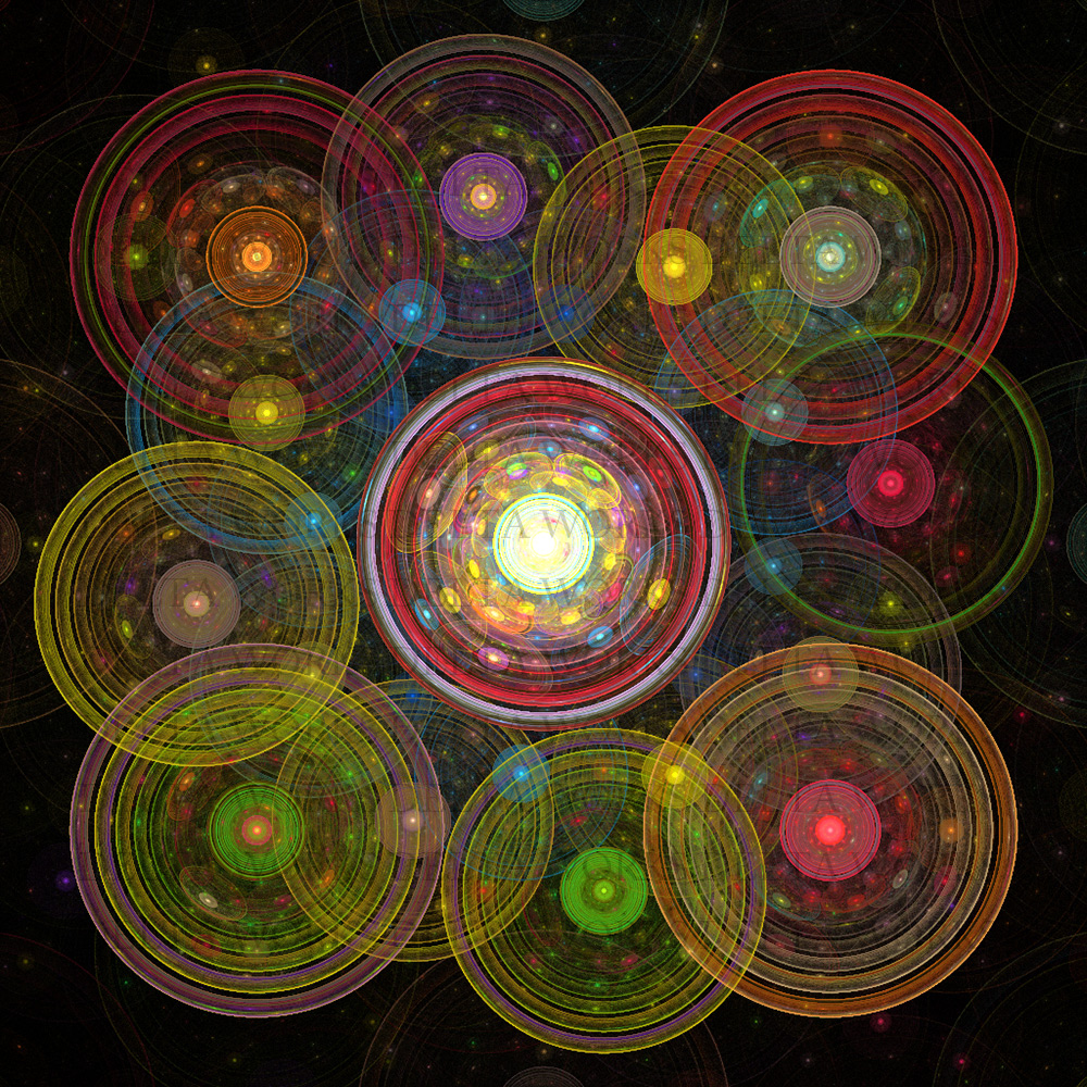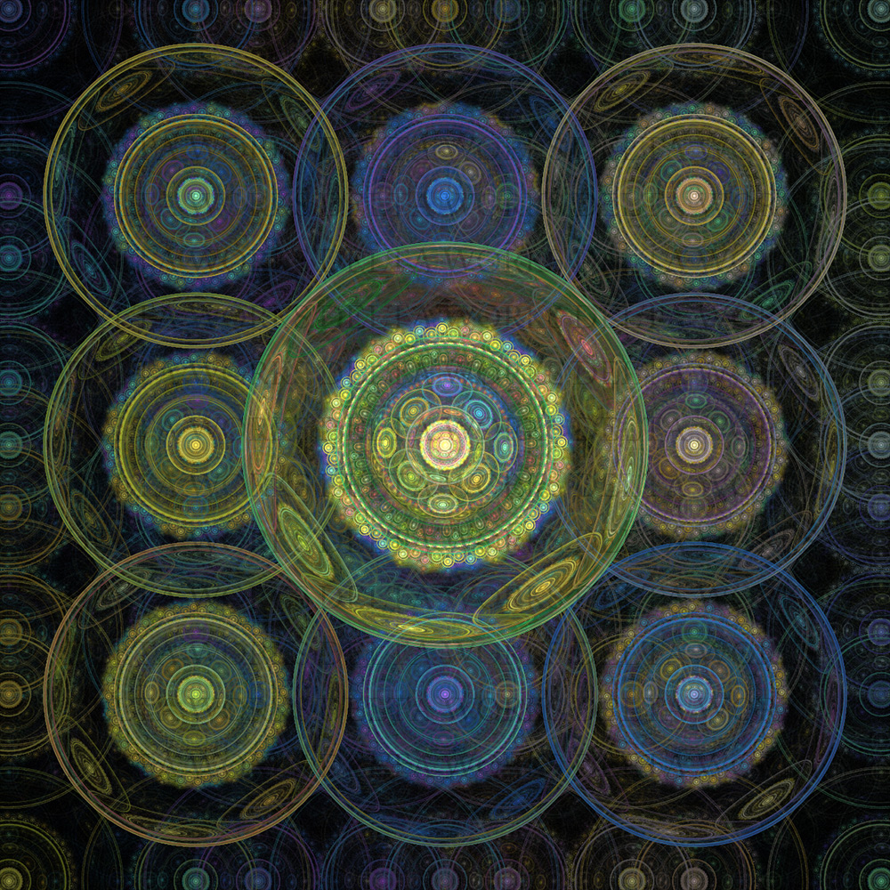 曼荼羅とは密教の経典に基づいて、諸仏を配置した図形を言います。「曼荼羅」は、サンスクリット語 मण्डलの音を漢字で表したもので、漢字自体には意味はありませんが。形容詞として、「丸い」という意味もあり、完全を意味する円形が多く使われています。これらは様々な形で派生系が存在していおり、このフラクタル曼荼羅は、円による造形としてフラクタル理論をベースに作られています。